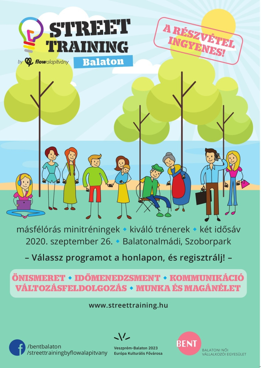 A főváros után, idén és Magyarországon először, Balatonalmádi ad otthont a Street Training Balaton elnevezésű ingyenes programnak. Az újszerű szabadtéri tanulási eseményt, melyet a BENT Egyesület a FLOW Alapítvánnyal karöltve szervez, a három éve indított budapesti Street Training és Street Training Online mintájára rendezik meg - tudtuk meg nagyné Czuri Esztertől, a BENT Balatoni Női Vállalkozói Egyesület elnökétől. A szervezők vallják: „tanulni bárkitől, bármikor, bárhol lehet. "Az őszi balatoni esemény célja is az, hogy nyitott és érdeklődő emberek összegyűljenek a balatonalmádi Szoborparkban, másfél órára egy-egy téma körül leüljenek, beszélgessenek, és tanuljanak belőle."