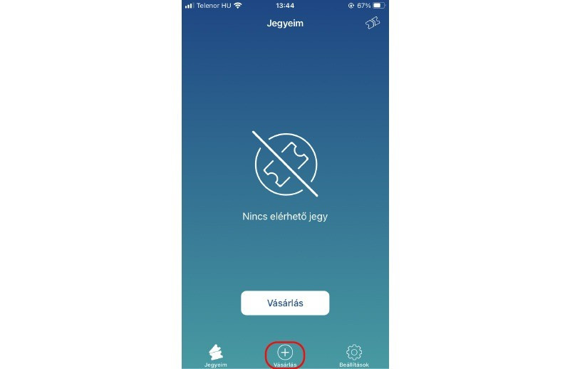 A „Mobiljegy” alkalmazást elindítva a lenti, középső „Vásárlás” ikonra kattintva kezdhetjük meg a jegyvásárlást.
