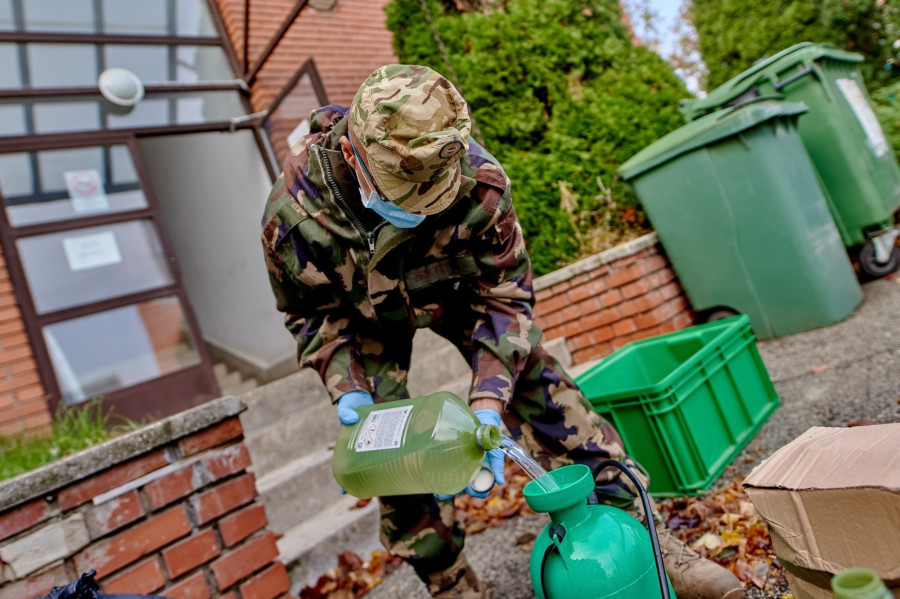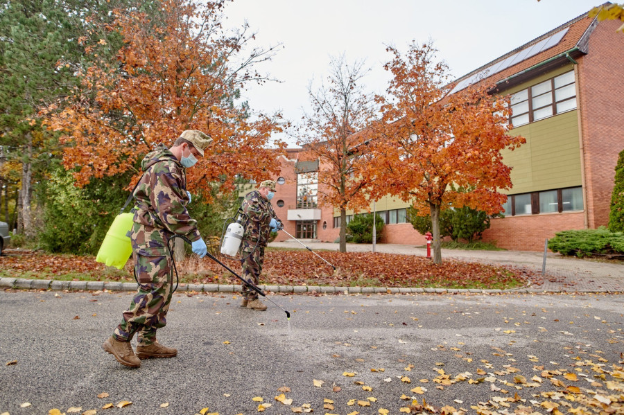 Akkor csak szintenként tudtak haladni: meg kellett várniuk, amíg a bentlakó időseket egyik emeletről a másikra átköltöztetik. Ezúttal könnyebb dolguk van: az oktatási intézmények üresen állnak az őszi szünetben, így ezek fertőtlenítésével is gyorsan végeztek a katonák.
