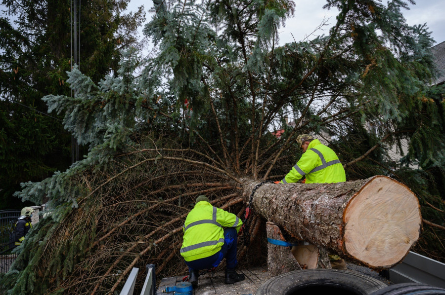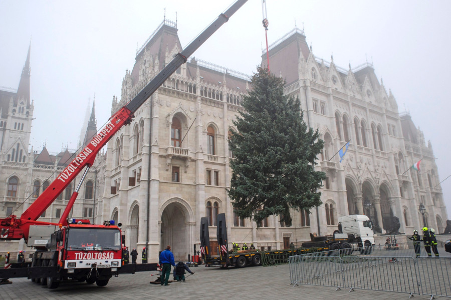 A fát a székesfehérvári hivatásos tűzoltók vágták ki a Surányi utcai ház kertjében, majd daru segítségével a Magyar Honvédség speciális szállítójárművére emelték. A katasztrófavédelem tájékoztatása szerint holnap délelőtt állítják fel a négy tonna súlyú fenyőt az Országház mellett.