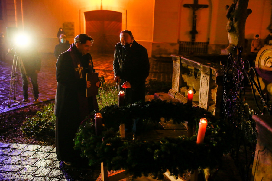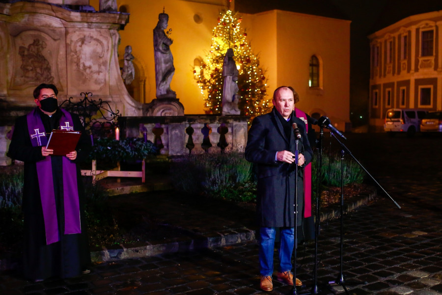 Porga Gyula polgármester emlékeztetett: régi szép hagyomány Veszprémben, hogy az adventi hétvégén közösen gyújtjuk meg a város adventi koszorújának gyertyáit. A járványhelyzetben azonban sok mindenről le kellett mondanunk, de abban egyetértettek Udvardy György érsekkel, hogy a gyertyagyújtás apró, szűk körű szertartását mégis meg kell őrizni.