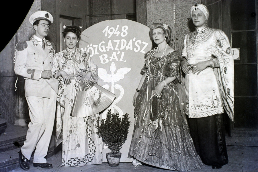 Az arisztokrácia körében az alakoskodások helyett az itáliai eredetű karneválozás jóval fényűzőbb szokása terjedt el. A képen a Gellért Gyógyfürdőben tartott 1948-as Közgazdász bál résztvevői pózolnak a főbejáratnál. A fotó adományozója Hámori Gyula.