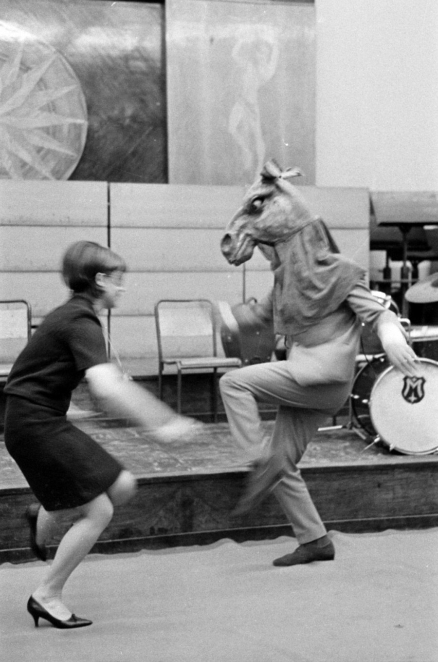 A Magyar Rádió Álarc nem kötelező címmel nyilvános farsangi műsort is sugárzott. 1964-ben, a 6-os stúdióban sikerült lencsevégre kapni ezt az állati pillanatot. /Fotó adományozója: Szalay Zoltán