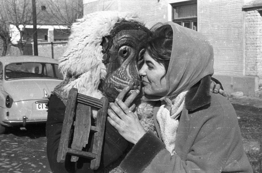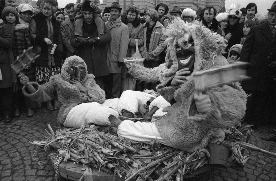 A téltemető szokások leglátványosabb verziója egyértelműen a jelmezes felvonulás volt. A világ számos országában zajló vidám karneválok közös jellemzője, hogy az utolsó farsangi hétvégére esnek, illetve a hosszabb ideig tartóknak ekkor van a csúcspontjuk. Hazánkban a legismertebb farsanghoz kötődő maszkos felvonulás a mohácsi busójárás. / Kép forrása: Erdei Katalin, 1979