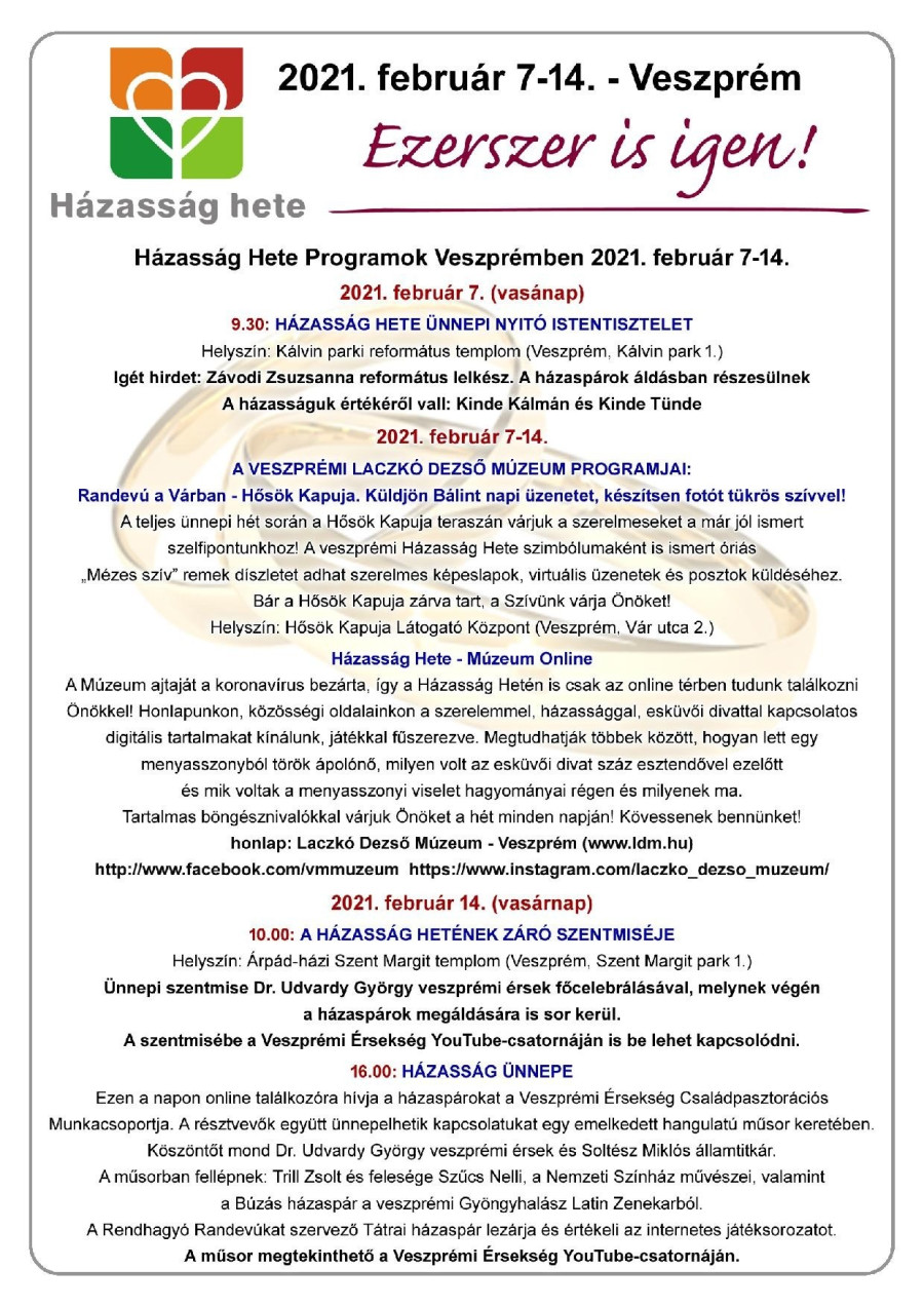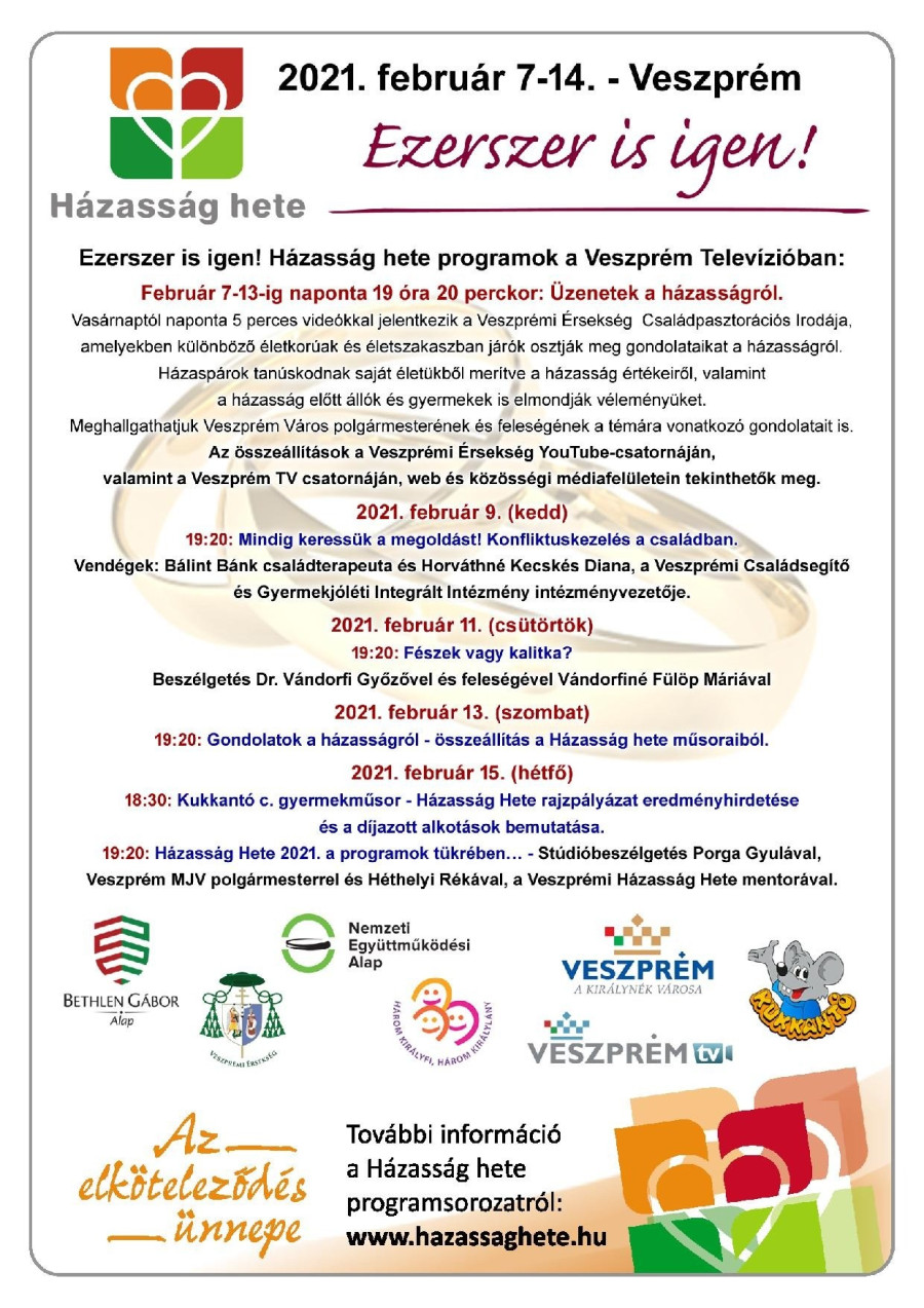 A Házasság Hete programjait online a legegyszerűbben a Veszprémi Érsekség Youtube-csatornáján, illetve a Veszprém TV médiafelületein lehet nyomon követni.