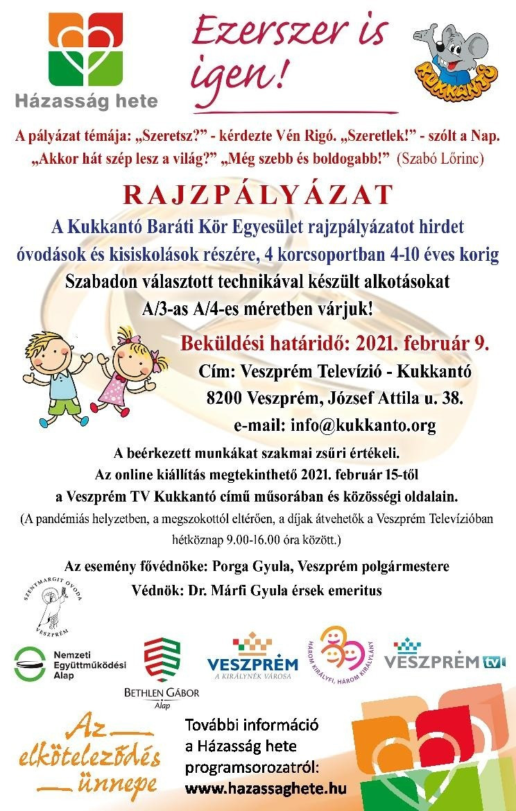 Ezeken kívül a Házasság Hete programsorozat részeként a Kukkantó Baráti Kör egy rajzpályázatot is hirdet a 4-10 év közötti gyermekek számára, melynek témája Szabó Lőrinc egyik idézete: "Szeretsz? - kérdezte a Vén Rigó. "Szeretlek!" - szólt a Nap. "Akkor hát szép lesz a világ?" "Még szebb és boldogabb!" A rajzpályázatban nincs kikötve a stílus, vagy a technika. A műveket február 9-ig várják a Veszprém Televízió - Kukkantó, 8200 Veszprém, József Attila út 38. címre, vagy online az info@kukkanto.org címre.