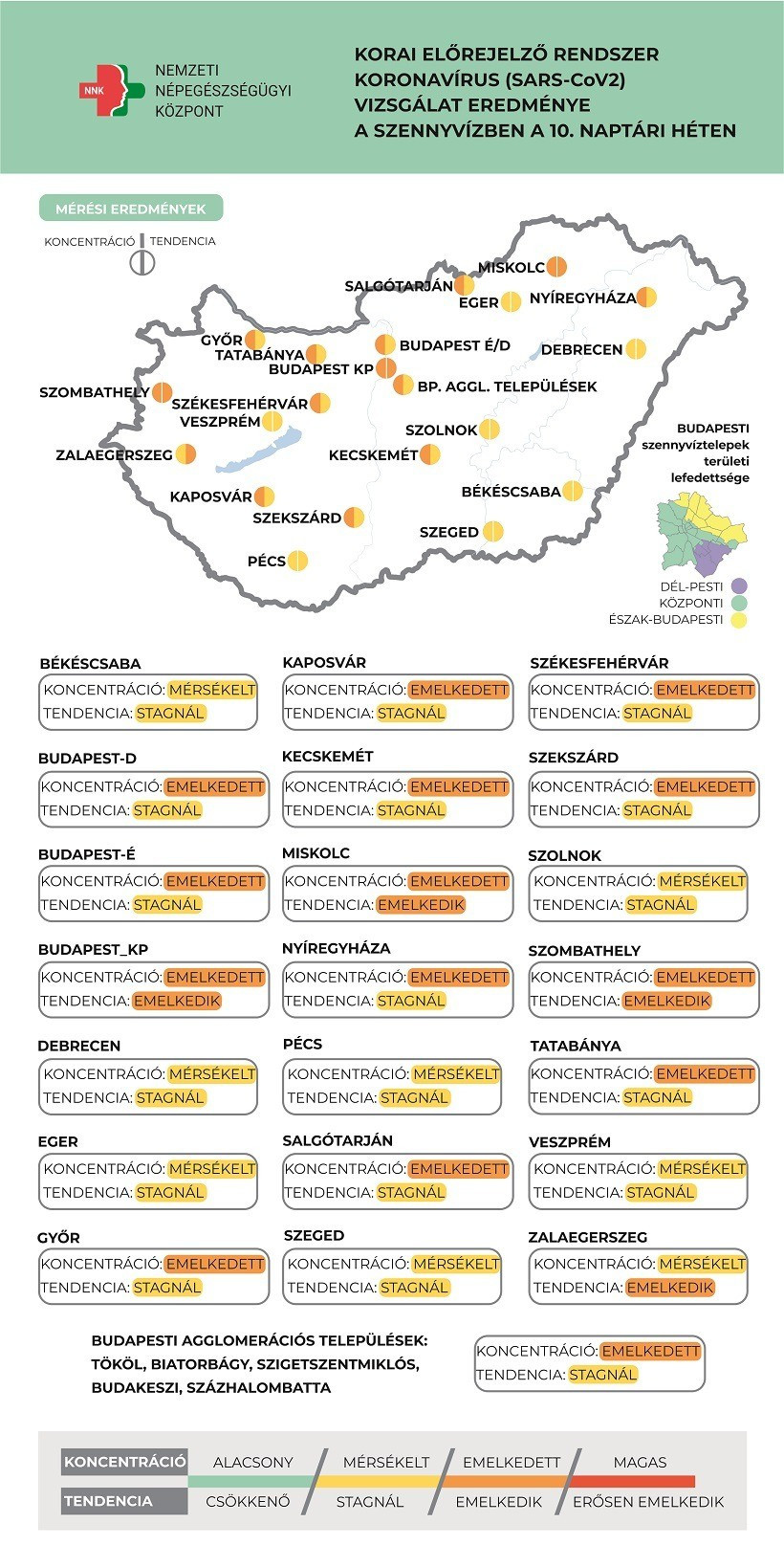 A 10. héten tovább növekedett a szennyvízminták átlagos koronavírus koncentrációja, az eredmények meghaladták az őszi járványcsúcs esetében tapasztalt értékeket. A vizsgált szennyvízminták esetében emelkedés mérhető Budapest központi szennyvíztisztító mintájában, Miskolcon, Szombathelyen, Zalaegerszegen. A többi városban a koncentráció stagnált, míg csökkenés ezen a héten sem volt sehol tapasztalható egyik településen sem.