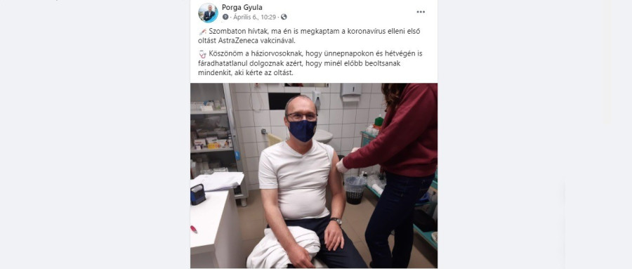 Porga Gyula posztjában beszámolt arról is, hogy előző szombaton kapta a hívást, hogy hamarosan megkapja az oltást, ami rákövetkező kedden megtörtént.