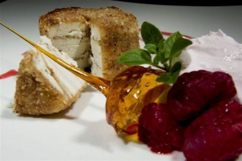 Dióba hempergetett, grillezett kecskesajt málnahabbal