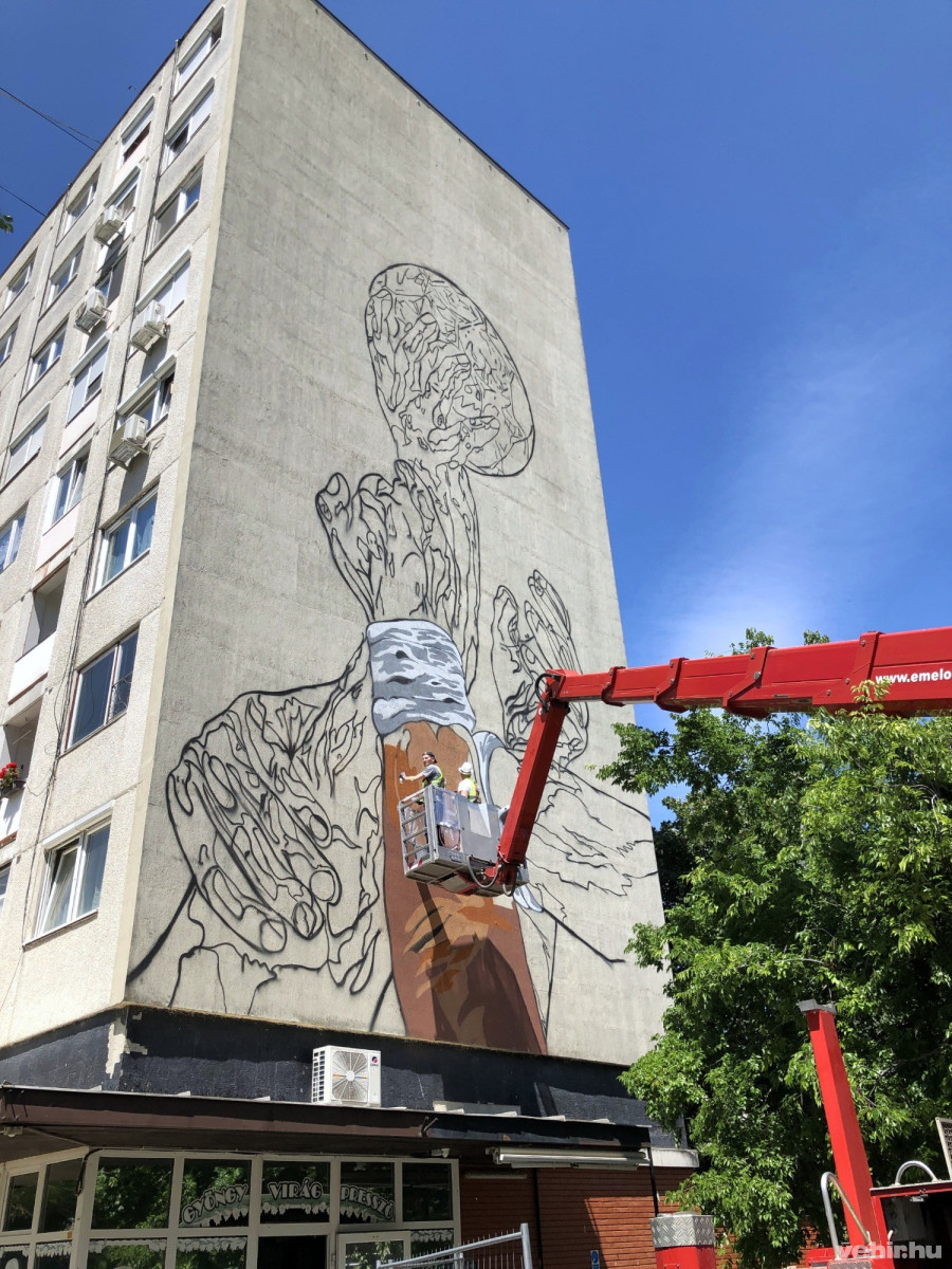 Pár hete a Lélektér Alapítvány Facebook-oldalán lehetett szavazni arról, hogy melyik kép kerüljön fel a Halle utcai tízemeletes keleti falára. A közönségszavazás után most pedig elérkezett az idő, amikor a rapper ténylegesen is elkezdte megvalósítani az ötletet.