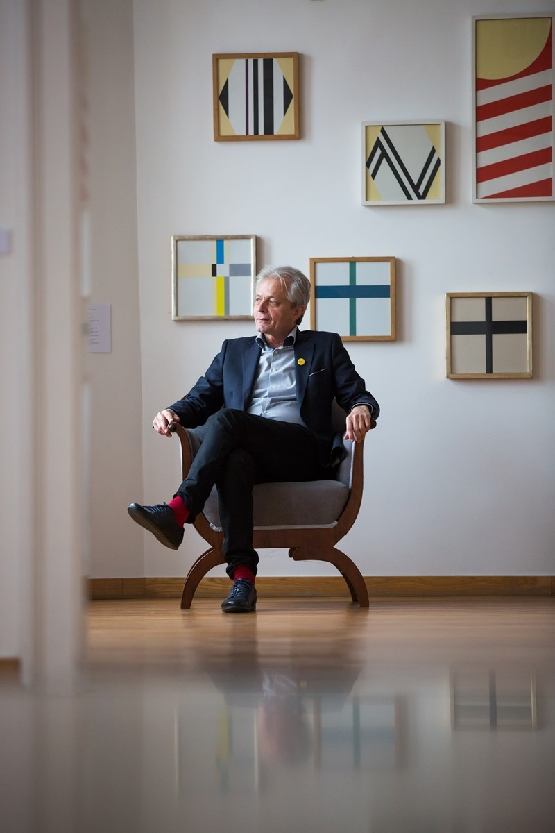 Nehezen. A súly áttevődött az igazgatói munkára. De helyretettem magamban – nem frusztrált az, hogy nem tudok eleget festeni vagy alkotni. Azt gondolom, ha jobban nyomna ez a dolog, akkor biztos többet festenék. Ez alkat kérdése is. Nyilván más, amikor valaki reggel bemegy magányos alkotóként a műterembe, és napi 8 órát ott dolgozik, és más, ha intézményt vezet. A művészetközvetítő munka annyi nagyon jó szakmai kapcsolatot adott, amit független, önálló alkotóként soha nem lehetett volna elérni. Másrészt mindig nagyon érdekelt a művészet praktikussága – a látványtervezés, a díszlettervezés, tipográfia. Mindig is volt polgári foglalkozásom, nem választottam szabadúszóként a bizonytalanságot. Rendeztem kiállításokat, tanítottam, terveztem könyvet, plakátot, színházi díszletet, kiadványokat… A vizualitást komplex egységként fogom fel. Ezért szoktam mondani, hogy nem festőművész, hanem képzőművész vagyok.