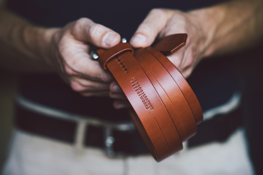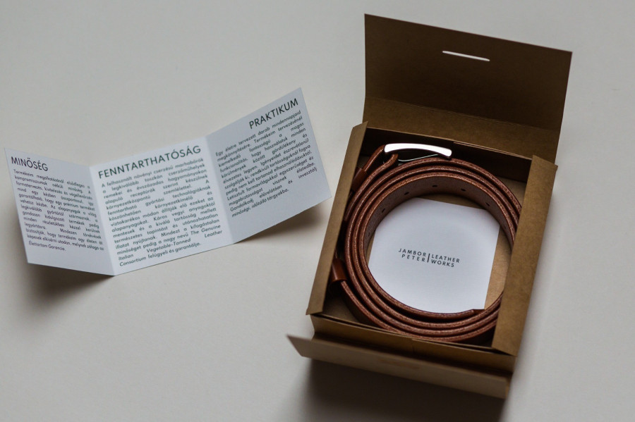 Úgy tűnik, a bőrművességben azért megtalálta a helyét, az elvei mellett pedig kétségtelenül kitart. A minimalista forma mellé maximalista hozzáállás társul: Peti a legnagyobb precizitással készíti termékeit, prémium minőségre, praktikumra és fenntarthatóságra törekszik minden téren. Az alapanyagokat Olaszországból szerzi be, ahol a mai napig rengeteg kis családi manufaktúra található, és ahol a környezeti terhelésre is odafigyelve, hagyományos gyártási technológiával állítják elő a növényi cserzésű marhabőröket. „Ez egy kicsit hosszadalmasabb folyamat, azonban fontos számomra, hogy fenntartható forrásból származzanak az anyagok és ne tartalmazzanak egészségre káros vegyületeket. Másrészt ettől lesz olyan finom tapintása és kellemes illata a bőrnek” – magyarázza, miközben felém nyújt egy félkész derékszíjat, hogy leellenőrizhessem, ez valóban így van.