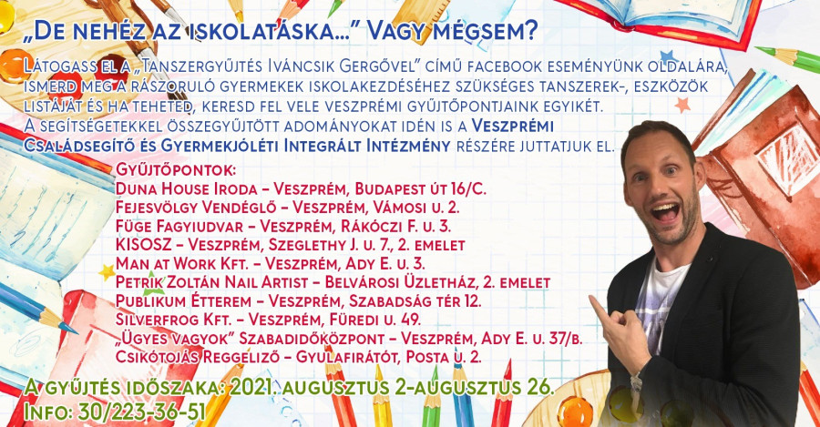 Korona Vivien magán kezdeményezéséhez Iváncsik Gergő, legendás veszprémi kézilabdázó is csatlakozott. Az akció keretein belül az idei évben mintegy 350 család tanévkezdését segítheti minden olyan veszprémi lakos, aki a kijelölt gyűjtőpontok valamelyikén a lehetőségeihez mérten megvásárolt tanszerek adományozásával felkarolja az érintett családokat. A kezdeményezéshez már veszprémi Continental is jelezte csatlakozási szándékát, a jó ügyért tett összefogás így válthat egy - egy munkahelyi kollektíva közösségformáló erejévé is.