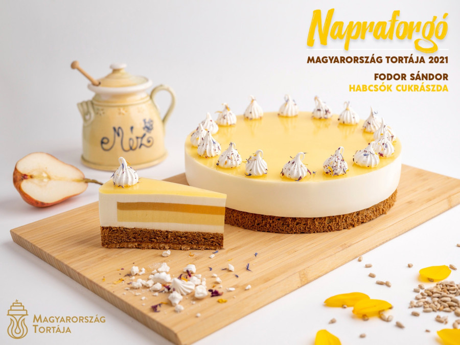Bár a nyertest, Fodor Sándort (Habcsók Cukrászda, Budapest) a NAPRAFORGÓ ötletének szárba szökkenésekor a nyári napraforgó mezők inspirálták, mégis egy igazi négy évszakos torta született. Jól esik a nyári melegben, a vilmoskörte üdeségével és a hársmézes friss joghurt savanykásságával, a hűvösebb napokon pedig, amikor melegebb ízekre vágyunk, a pirított napraforgó telt ízével és karamellizált csokoládéval kényeztet. Csokoládés, ropogós talpon, búzaliszt mentes, pirított napraforgó őrleménnyel készült felverten helyezkednek el a különböző textúrájú rétegek. A napraforgó, a csokoládé, a körte és a méz „szeretik egymást”, körbeérnek az ízek, melyeket a vilmoskörte pálinka még inkább kiemel.