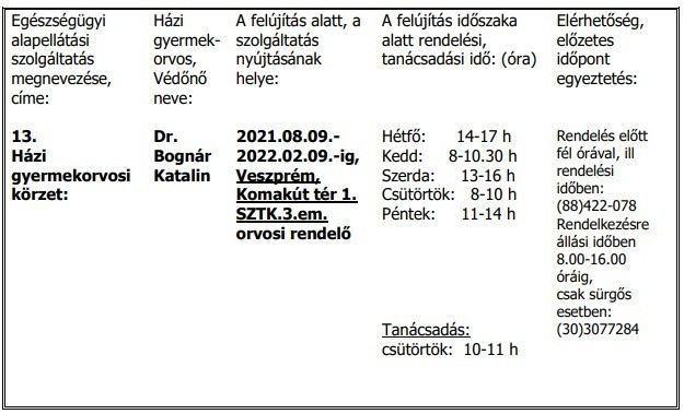 A beruházás befejezését követően – várhatóan - 2022. február 9.-től a fenti szolgáltatások ismét a Veszprém, Vilonyai utca 2/B. szám alatti, korszerűen felújított házi gyermekorvosi rendelőkben a megszokott rendelési és tanácsadási időpontokban vehetők igénybe.