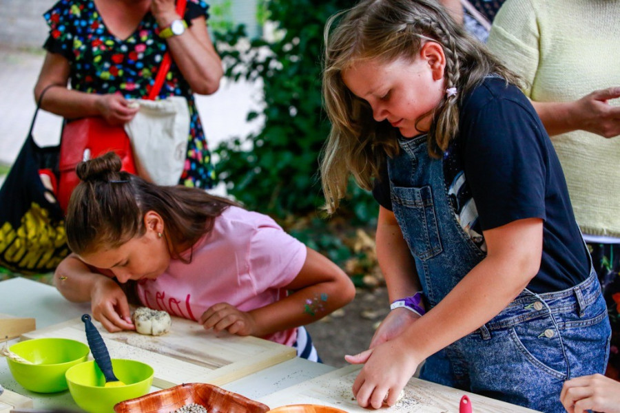 Mindeközben a múzeumkert és a Bakonyi Ház különböző szegleteiben a gyerekek maguk is kipróbálhatták a kenyérkészítés néhány hagyományos mozzanatát: kézi malommal maguk őrölhettek lisztet a búzából; a vállalkozó szelleműek pedig saját kezűleg formázott vekniket süthettek a Bakonyi Ház szabadtéri kemencéjében. Addig sem kellett tétlenül várakozni, míg a tészta ropogósra pirult: egész délután lehetőség volt kenyérzsák készítésére is.