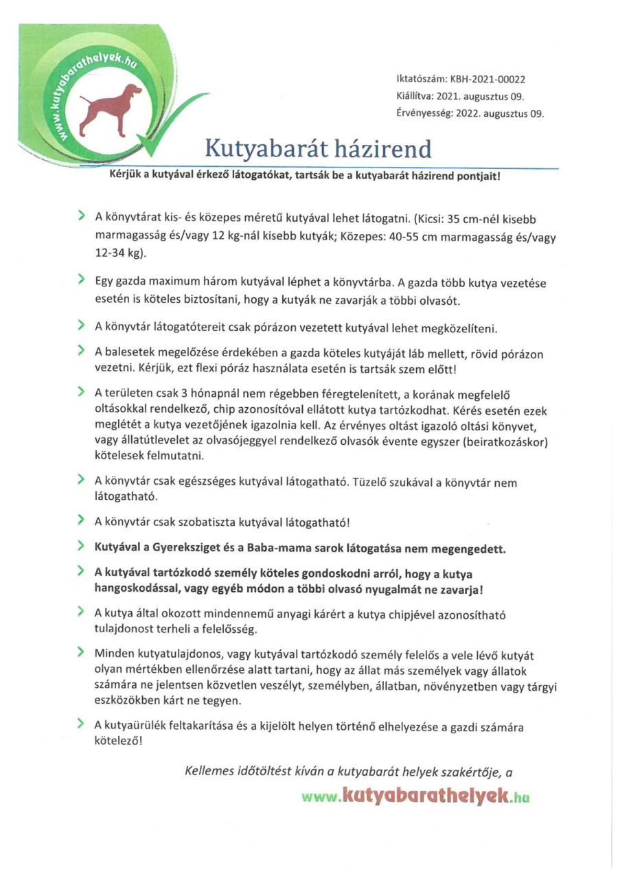 - a könyvtárat kis és közepes méretű kutyával lehet csak látogatni