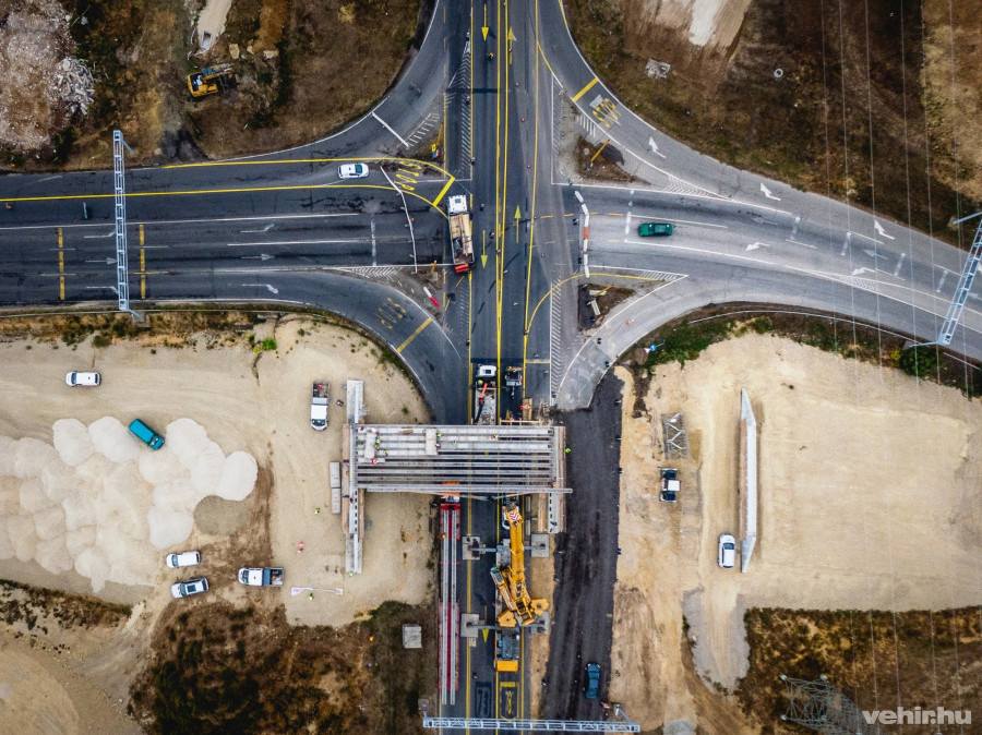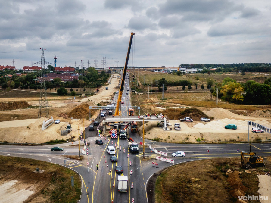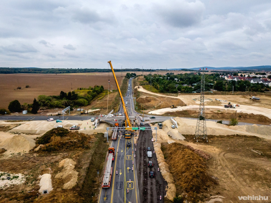 Pénteken kora délután a darusautó már a helyére is emelte a felüljáró első hídgerendáit, a következő napokban pedig folytatják ezt a munkát.