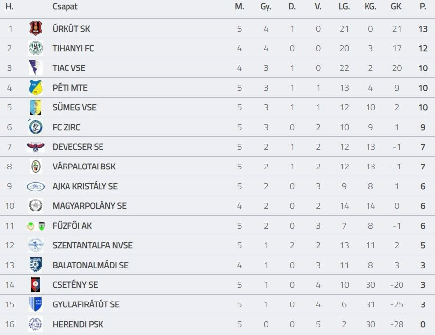 Hétvégén ötödik köréhez érkezett a VEHIR.HU labdarúgó élvonal mezőnye. Az elmúlt fordulókban több csapatnak is sikerült megőriznie hibátlan mérlegét: az éllovas Úrkút még gólt sem kapott, de a második Tapolca, illetve a harmadik Tihany szintén megnyerte az eddigi mérkőzéseit.