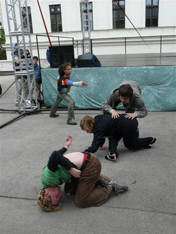 A Co.ffein Projects egészen fiatal csapat, öt táncos, Várnagy Kristóf, Dobi András, Kolozsi Viktória, Baranyai Balázs és Schnentz Johanna újszerű ötlettel álltak elő. Mindannyian Frenák Pál tanítványai, akik a több éves közös munka után megalakították saját társulatukat, minden eddigitől eltérő célkitűzéssel és eszközrendszerrel. A mai rövid bemutatkozójuk tökéletesen tükrözi az egyedi szándékot: spontán, a nézőkkel, az utcán járókelőkkel és a közelükben található tárgyakkal közösen, az adott pillanatban szülni meg egy produkciót. Kedvesen pimasz játékukra nem lehet nem odafigyelni, felráz, provokál. A fiatalokkal több alkalommal találkozhatunk még a fesztivál ideje alatt.