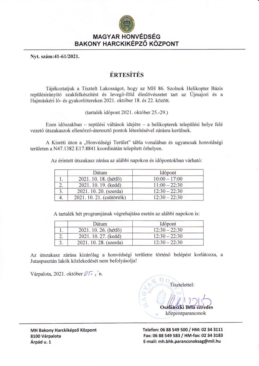 Értesítés hadgyakorlat miatt történő útlezárásról