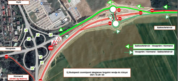 A jelenleg használt T4-jelű terelőút megszűnik, a forgalom a megépült csomópontot részlegesen használhatja majd közlekedésre a térképen világoszölddel jelölt nyomvonalon a régi Budapesti csomópont irányába. Székesfehérvár felől a régi Budapesti csomópont irányából a térképen jelölt sötétebb zöld nyomvonalon haladhat a forgalom. A régi Budapesti csomópont Veszprém-Körmend direkt csomóponti ága továbbra is lezárva marad.