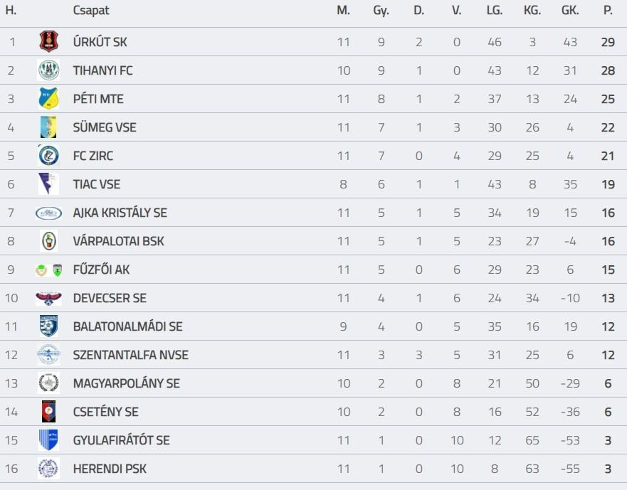 Október utolsó hétvégéjén a tizenegyedik fordulójához érkezett a vehir.hu I. osztályú labdarúgó-bajnokság. Az éllovas gárdákra (Úrkút, Tihany) könnyű megmérettetések vártak: előbbi 4-1-re verte a házigazda Csetényt, míg utóbbi 2-0-ra nyert a vendég Szentantalfa ellen.
