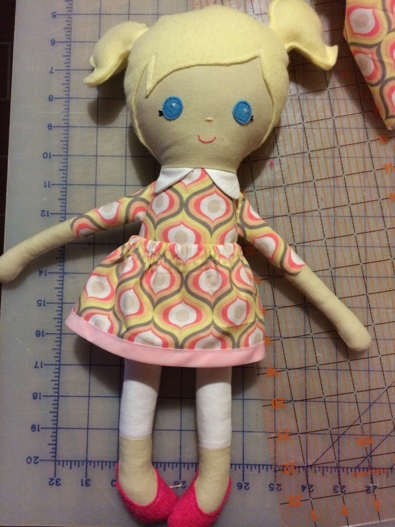 Ezután következhet a test, és a ruhához választott mintás pamut. A fejhez és testhez választott anyagokat tegyük egymásra, közéjük pedig a gallért illesszük. 1 cm-es szegéllyel varrjuk össze a három egymáson lévő anyagot.