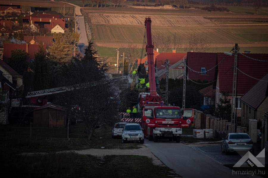 Vasárnap a Veszprém Megyei Katasztrófavédelmi Igazgatóság szakemberei és speciális járművei segítségével vágták ki, majd a közeli villanyvezetékek miatt óvatosan emelték át az MH Katonai Közlekedési Központjának különleges szállítójárművére a fenyőfát a nemesvámosi családi ház udvarából.