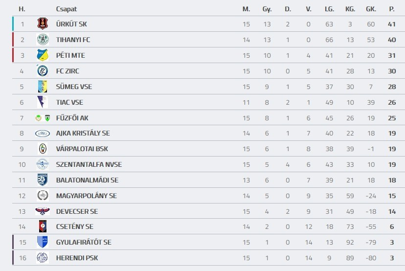 Az Úrkút ezzel megőrizte egypontos előnyét a Tihannyal szemben, őszi bajnokot azonban még nem hirdethetünk, hiszen a Balaton-partiak december 11-én még pályára lépnek Tapolcán az első fordulóból elhalasztott mérkőzésükön.