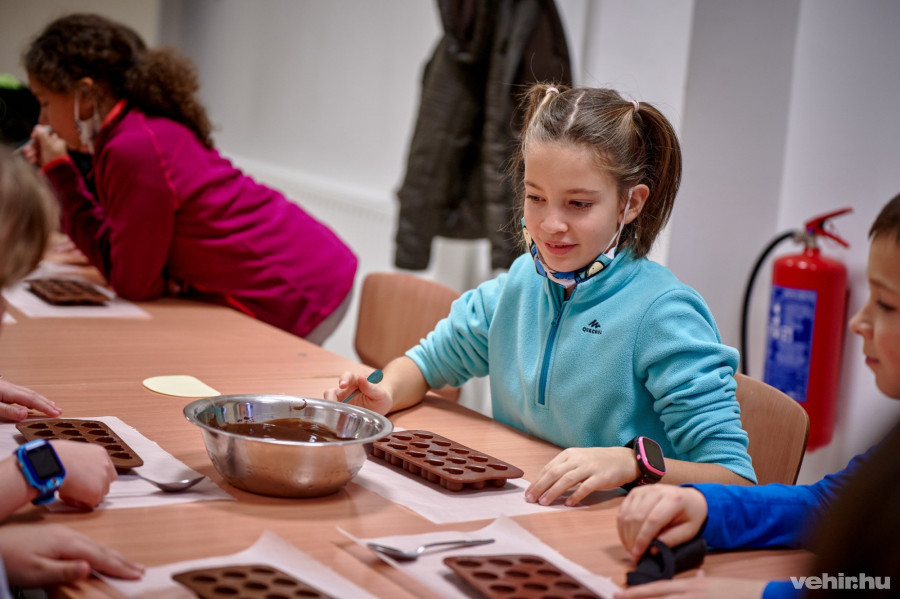A gyerekek pedig szemmel láthatóan nagy élvezettel vetették bele magukat a bonbon készítés fázisaiba: előbb a csoki burkát készítették el, majd különböző ízesítéssel töltötték meg őket, aztán némi hűtés és az utolsó simítások után már fogyasztásra alkalmasak is voltak a bonbonok. De a várakozási idő alatt van lehetőség már kész csokikat kóstolni, kitalálós játékot játszani, megismerkedni a csoki alapját adó kakaóbabbal és a kakaóvajjal.