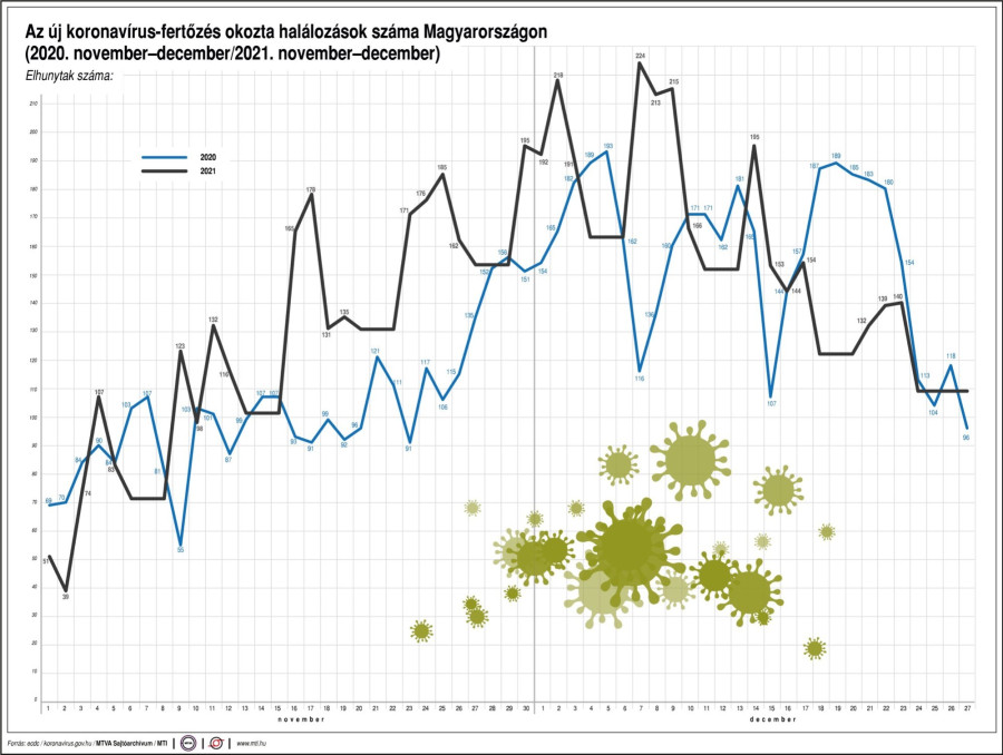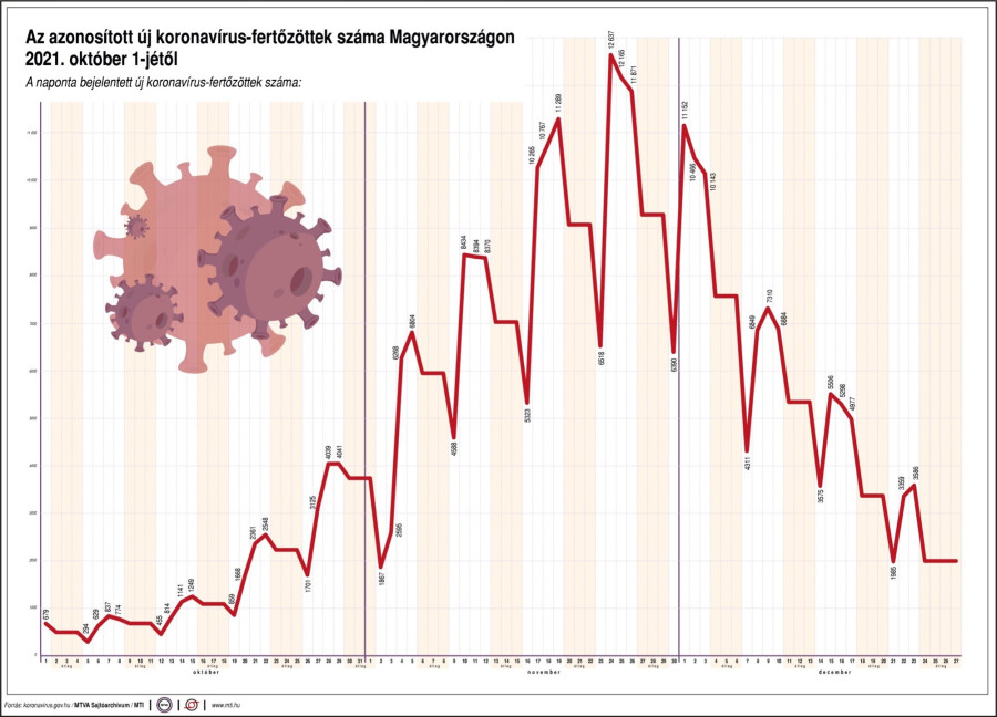 Az 51. héten naponta átlagosan 2417 új fertőzöttet igazoltak, egy héttel korábban ez az adat 4209 volt, a csökkenés mértéke 43 százalékpont. Naponta átlagosan 121 koronavírusos beteg halt meg, egy héttel korábban 145, a csökkenés mértéke 17%. Naponta átlagosan 210-zel csökkent a kórházban ápolt fertőzöttek száma, egy héttel korábban az átlagos napi csökkenés 142 volt (-33%), míg lélegeztetőgépen 94-gyel kevesebben vannak, mint múlt hétfőn (az egy héttel korábbi csökkenés 62 volt).