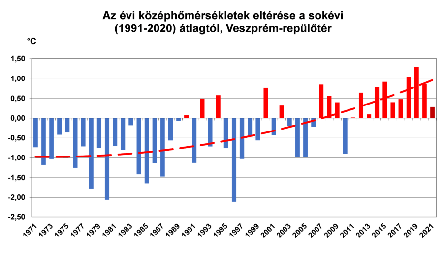 A Veszprém-repülőtéri meteorológiai mérőállomás adatai szerint az évi középhőmérséklet 10,7 C-foknak adódott, ez 0,3 C-fokkal magasabb a sokévi átlagnál, tizenhatodik az 1971 óta jegyzett adatsorban. Az évi átlagos hőmérséklet elfedi azokat a szélsőségeket és anomáliákat, amelyek a 2021-es évet jellemezték.