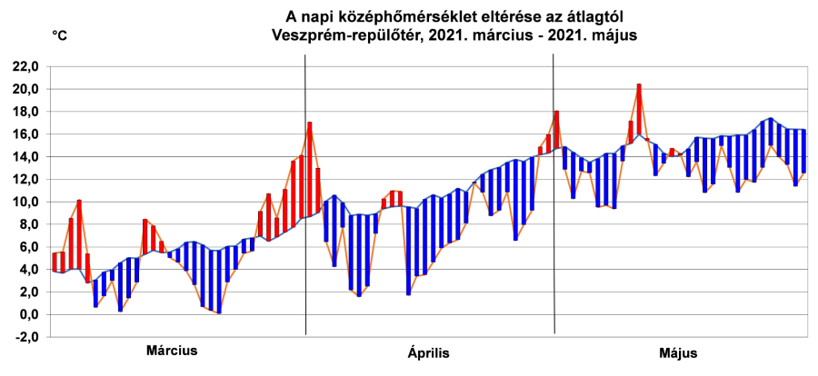 A tavaszt szélsőséges hőmérsékleti ugrások jellemezték. Március első napjaiban 4-6 fokkal volt melegebb az átlagnál, ugyanakkor 21-én „csak” 0,1 C-fok volt a napiközéphőmérséklet, 6 fokkal alacsonyabb az átlagnál. Április 1-én a napi középhőmérséklet 8,5 fokkal haladta meg az átlagot, míg 5-e és 9-e között fagyott. Május 1-én még 20 C-fok feletti hőmérsékletet mérhettünk, de 2-tól egy hidegfront véget vetett az enyhébb napoknak. Ezt követően a délutáni hőmérsékletek rendre 20 C-fok alatt maradtak, 8-án reggelre 2,4 C-fokig hűlt a levegő. Május 9-12 között enyhébb napok következtek. 11-én a délutáni hőmérséklet 27,5 C-fokon tetőzött, így ez lett a legmagasabb hőmérséklet 2021 tavaszán. 13-án egy újabb hidegfront okozott az évszaktól hűvösebb időt és az átlag alatti hőmérséklet kitartott a hónap végéig.