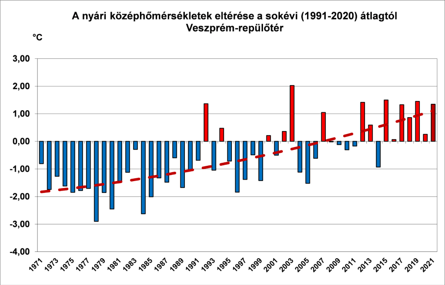 2021 nyara rövid volt, forró és száraz. Az átlagnál 1,4 C-fokkal volt melegebb, ezzel a hatodik legmelegebb az 1971 óta jegyzett adatsorban. A június közepétől augusztus közepéig tartó kéthavi időszakot többnyire hőhullámok jellemezték, míg az évszak eleje és vége a szokásosnál hűvösebb idővel telt. Június 2,4 C-fokkal, július 2,3 C-fokkal volt melegebb az átlagnál, a nyár első két hónapjának az átlaga megközelítette a 22,5 C-fokot, amihez hasonló a meteorológiai mérések kezdete óta nem fordult elő térségünkben. Június a harmadik, július a legmelegebb hónap lett a mérések kezdete óta. Az idei júliusnál csak az 1992-es augusztus volt melegebb, akkor 25,1 C-fok volt a havi középérték. A forró július után a nyár egy hűvösebb augusztussal zárult, középhőmérséklete 0,6 C-fokkal maradt el a sokévi átlagtól.