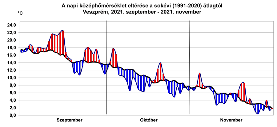 2021 ősze szélsőségektől mentes időjárást hozott. Nem dőltek sem havi sem napi rekordok, bár október 4-én a maximum hőmérséklet (25,2 C-fok) „csak” 0,2 C-fokkal maradt el a korábbi, 2011-es rekordtól. Az évszak középhőmérséklete 10,4 C-foknak adódott, ez 0,4 C-fokkal haladja meg a sokévi (1991 – 2020 közötti 30 év) átlagot. Szeptember volt a meleg, a szokásos 5 nyári nap helyett 12 napon haladta meg a hőmérséklet a 25 C-fokot. Október az átlagtól hűvösebb, november átlagos hőmérsékletű volt. Szeptember 17-ig még nyár volt, 15-én 29,9 C-fokig melegedett a levegő. A késői nyárnak 17-én egy hidegfront vetett véget, egyre hűvösebb levegő érkezett fölénk, 20 – 23 között a hőmérsékletek 3 C-fokkal a sokévi átlag alatt maradtak. 21-én volt a leghidegebb, reggelre 5,7 C-fokig csökkent a hőmérséklet.