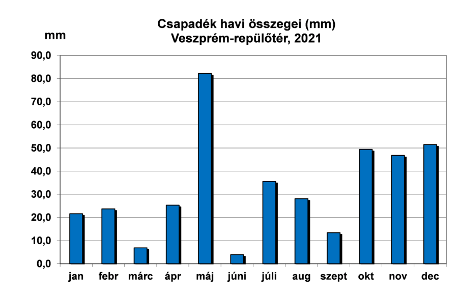 A nyári csapadékösszeg jelentősen elmaradt az átlagtól, 137,5 milliméterrel kevesebb eső esett az ilyenkor szokásosnál. Ilyen kevés nyári csapadék a repülőtéri mérések alapján Veszprémben nem fordult elő. Mindhárom nyári hónapban a szokásosnál kevesebb csapadék esett. 2021 júniusa negatív csapadék rekordot döntött. A repülőtéren négy csapadékos napon mindössze 3,9 mm eső esett, holott általában június az év egyik legcsapadékosabb hónapja, átlagosan 70 mm csapadékkal. A májusi bőséges csapadékhullás ellenére június második felére aszályhelyzet alakult ki, július első napjaira az éves csapadékhiány elérte a 100 millimétert.