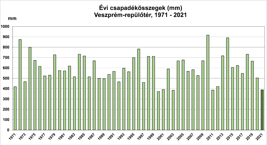 Aszályos év volt 2021. az éves csapadékösszeg 210 milliméterrel kevesebb a sokévi átlagnál. Vizsgálatunknál a 2020-as év csapadékösszegétől kell indulni, ugyanis 2020. is 100 milliméteres hiánnyal zárt, így az utóbbi két évben több mint 300 milliméter hiányt „halmozott fel” a természet. nem hagyhatjuk figyelmen kívül a magasabb hőmérséklet miatti intenzívebb párolgást, ami hamarabb előidézi az aszályos helyzeteket és fokozza annak káros hatását.