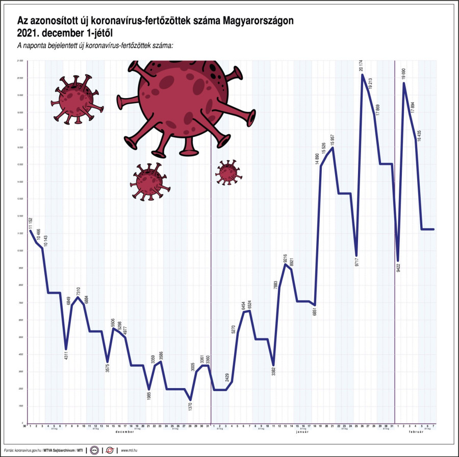 A beoltottak száma 6 374 293 fő, közülük 6 120 914 fő már a második, 3 735 329 fő pedig már a megerősítő harmadik oltását is felvette. Az elmúlt három napban 33 716 új fertőzöttet igazoltak, ezzel a járvány kezdete óta összesen 1 650 562 nőtt a beazonosított fertőzöttek száma. Az elmúlt három napban elhunyt 234 többségében idős, krónikus beteg, így az elhunytak száma 41 975 főre emelkedett. A gyógyultak száma folyamatosan nő, jelenleg 1 377 097 fő, az aktív fertőzöttek száma pedig 231 490 fő. 4919 koronavírusos beteget ápolnak kórházban, közülük 168-an vannak lélegeztetőgépen. A fertőzések 94%-át már az omikron okozza.