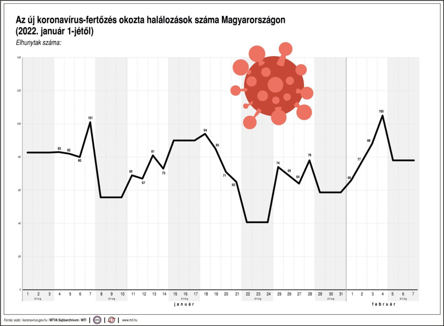 Az év ötödik hetében naponta átlagosan 13880 új fertőzöttet regisztráltak, egy héttel korábban 16003 volt a napi átlag, az ötödik hullám terjedése tehát 14 százzalékponttal lassult. Naponta átlagosan 81 koronavírusos beteg hunyt el, egy héttel korábban 66, a növekedés mértéke 22%. Az aktív fertőzöttek száma stagnál, a kórházban ápoltak száma 26%-kal, míg a lélegeztetőgépen lévők száma 12 százalékponttal nőtt múlt hétfő óta.