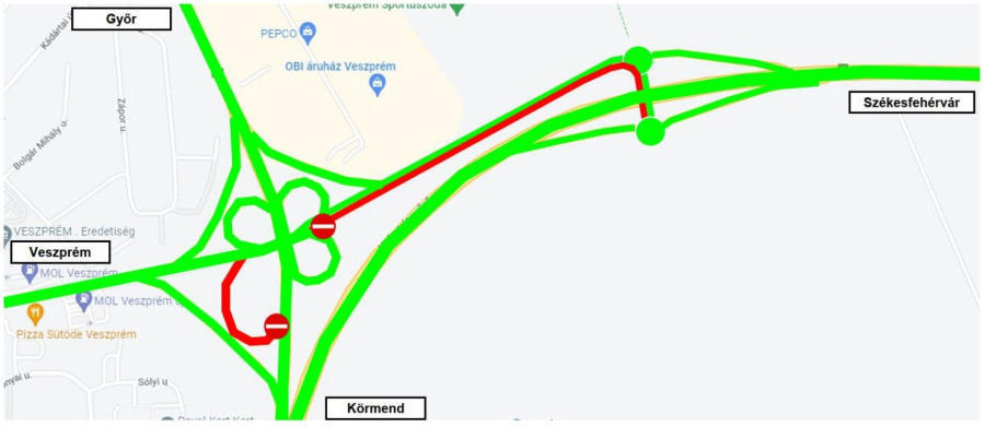 Forgalomtechnikai munkák miatt lezárásra kerül a régi és az új Budapesti csomópontot összekötő útszakasz bal oldala, valamint az új Budapesti csomópontban a körforgalmakat összekötő út bal oldala. Ezzel egyidőben szintén lezárásra kerül a régi budapesti csomópont képen jelölt ága is, így a Győrből Székesfehérvár felé közlekedőknek a Budapesti csomópontban ebben az időszakban nem lesz lehetősége felhajtani a 8. sz. főútra. Az ebből az irányból közlekedők az Almádi csomópontban tudnak visszafordulni Székesfehérvár felé a lezárás időtartama alatt.