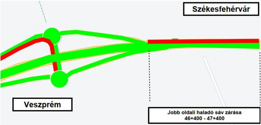 Lezárásra kerül a 8. sz. főút jobb pálya (Székesfehérvár- Veszprém irány) haladó sávja a 46+400-47+400 szelvények között, ezen a szakaszon csak az előző sávon haladhat majd a forgalom a lezárás időtartama alatt.