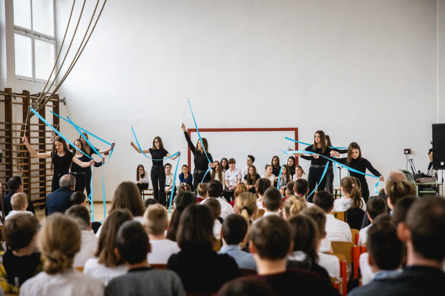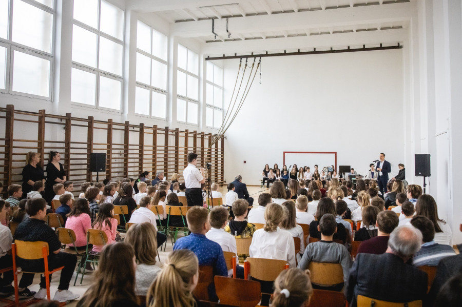 A beszédeket követően az iskola tanulói színes műsorral vették birtokba a megújult termet.