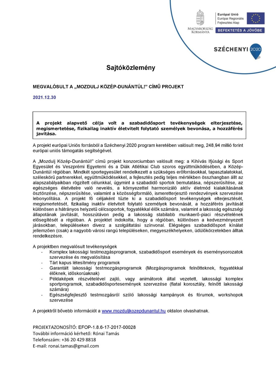 MEGVALÓSULT A „MOZDULJ KÖZÉP-DUNÁNTÚL!” CÍMŰ PROJEKT
