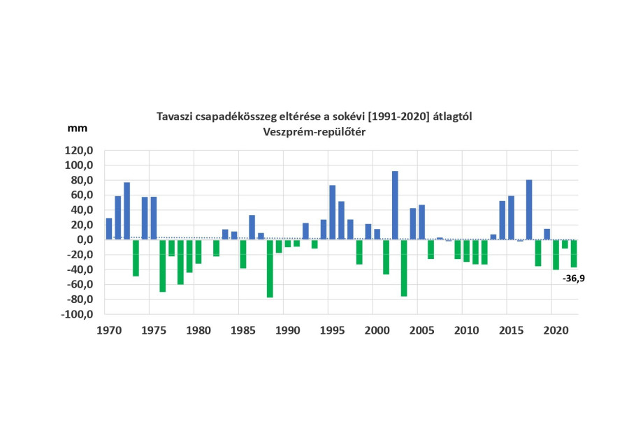 A 2022-es tavasz csapadékösszege a repülőtéri mérőállomáson 96,1 mm, ami 30 százalékkal marad el az 1991 – 2020 évek átlagától. A száraz januárt és februárt figyelembe véve, az év első öt hónapjában összesen 115,9 mm eső esett, amivel az ötödik legszárazabb évkezdetnek bizonyult az 1970 óta jegyzett adatsorban. A legszárazabb évkezdet 2001-ben volt 78,5 mm-es csapadékösszeggel.