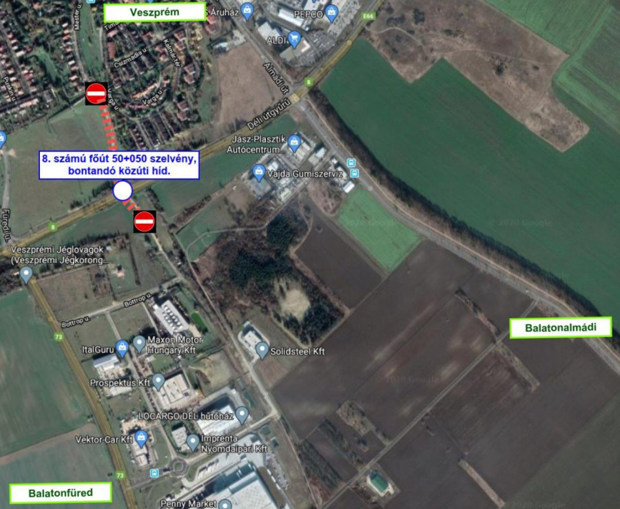 Ezzel egyidőben bal pályán az 50+050 szelvényében lévő közúti híd elbontása is megkezdődik, ezért a bontás idejére lezárják a Déli iparterületre vezető kerékpárutat. Ennek várható időtartama egy hónap, a Veszprém – Balatonalmádi kerékpárút továbbra is járható marad.