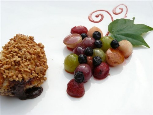 A pároláshoz a gyümölcsöket megmossuk, a szőlőt leszemezzük, az almából pedig karalábévájó segítségével golyókat formázunk. Egy serpenyőben a maradék vajon a cukrot karamellizáljuk, de óvatosan, kis lángon, nehogy a vaj megégjen. Hozzáadjuk az almagolyókat, a szőlőszemeket és az epret. 2–3 percig pirítjuk, majd a Triple Sec-kel flambírozzuk. Felengedjük a vörösborral, és felére beforraljuk. Ne főzzük túl sokáig, mert a gyümölcsök hamar szétfőnek. Végül hozzáadjuk az áfonyaszemeket.