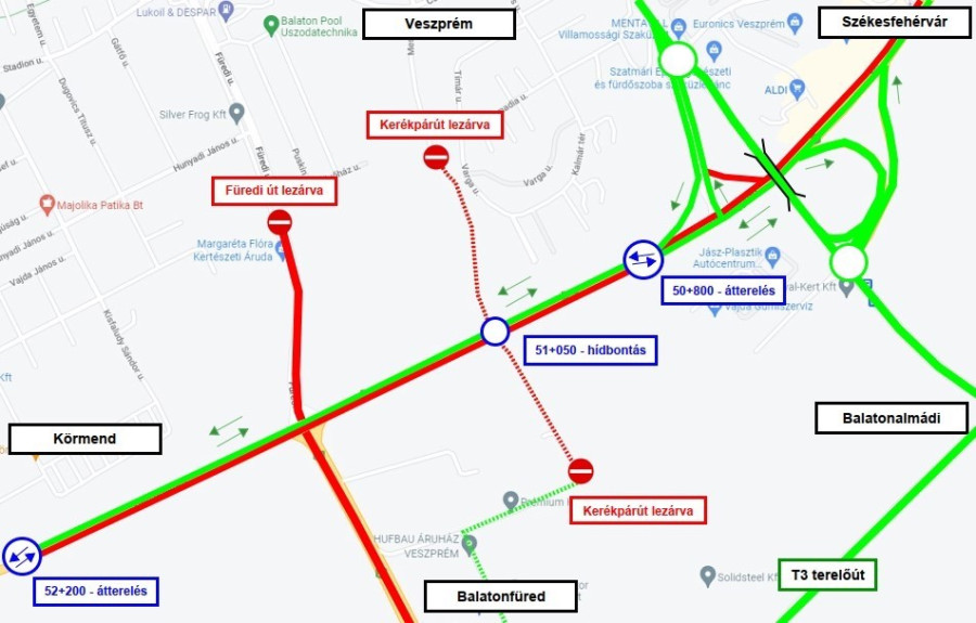 Tájékoztatjuk a közlekedőket, hogy Veszprémben 2022. június 21-től az Almádi csomópont és az 52+200 km szelvény között elkezdődik a 8. sz. főút bal pályájának elbontása, a forgalom már az elkészült jobb pályán fog haladni.
