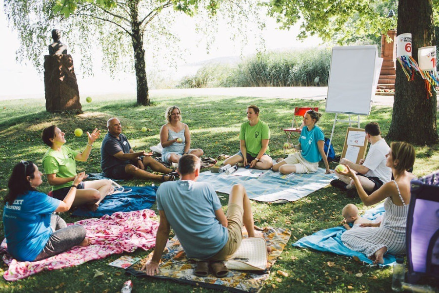 A 90 perces minitréningek két idősávban, 14 és 16 órakor kezdődnek. Egy résztvevő akár két egymást követő csoportba is jelentkezhet. Az árnyas-ligetes park kínálta természetes környezet és az egyedülálló balatoni panoráma szinte hívogat arra, hogy fiatalok és idősebbek fűre terített pokrócokon, csoportokba rendeződve dolgozzanak, beszélgessenek.