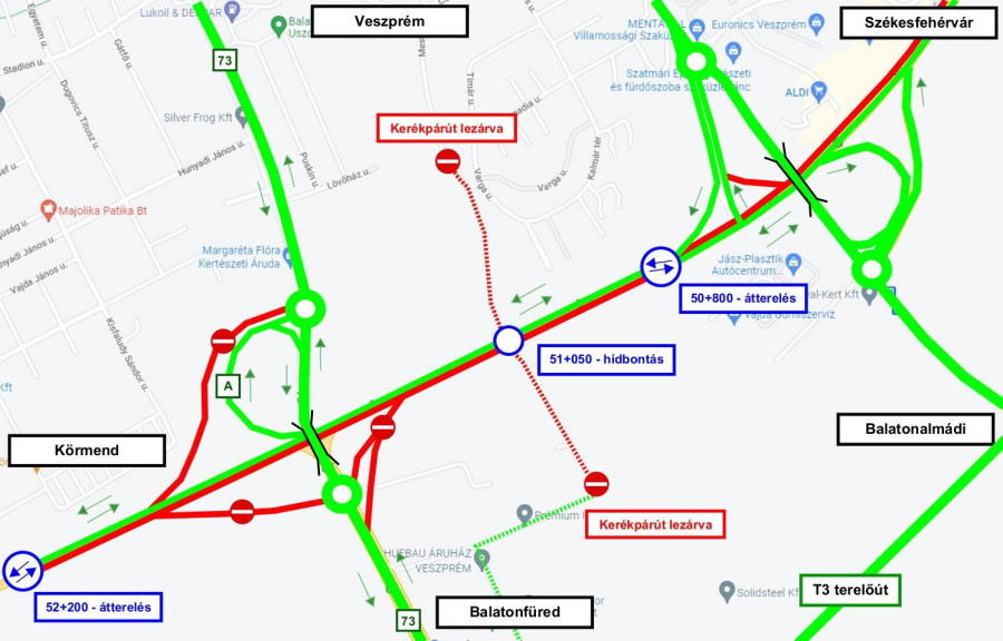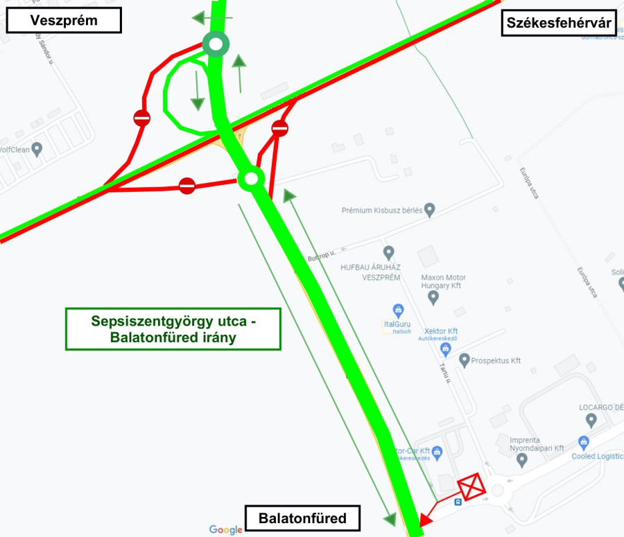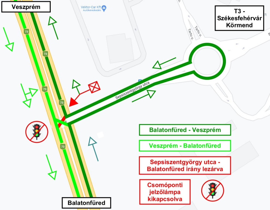A 73- as számú főút és a Sepsiszentgyörgy utca csomópontjában a jelzőlámpa továbbra is kikapcsolva marad az esetleges torlódások elkerülése miatt. Balatonfüred irányából Veszprémbe közlekedők a Sepsiszentgyörgy utcába jobbra behajtva, a körforgalomban visszafordulva és a 73- as számú főútra jobbra visszakanyarodva tudnak behajtani Veszprémbe (a térképen sötét zölddel jelölve) a 2. sz. ábra szerint.